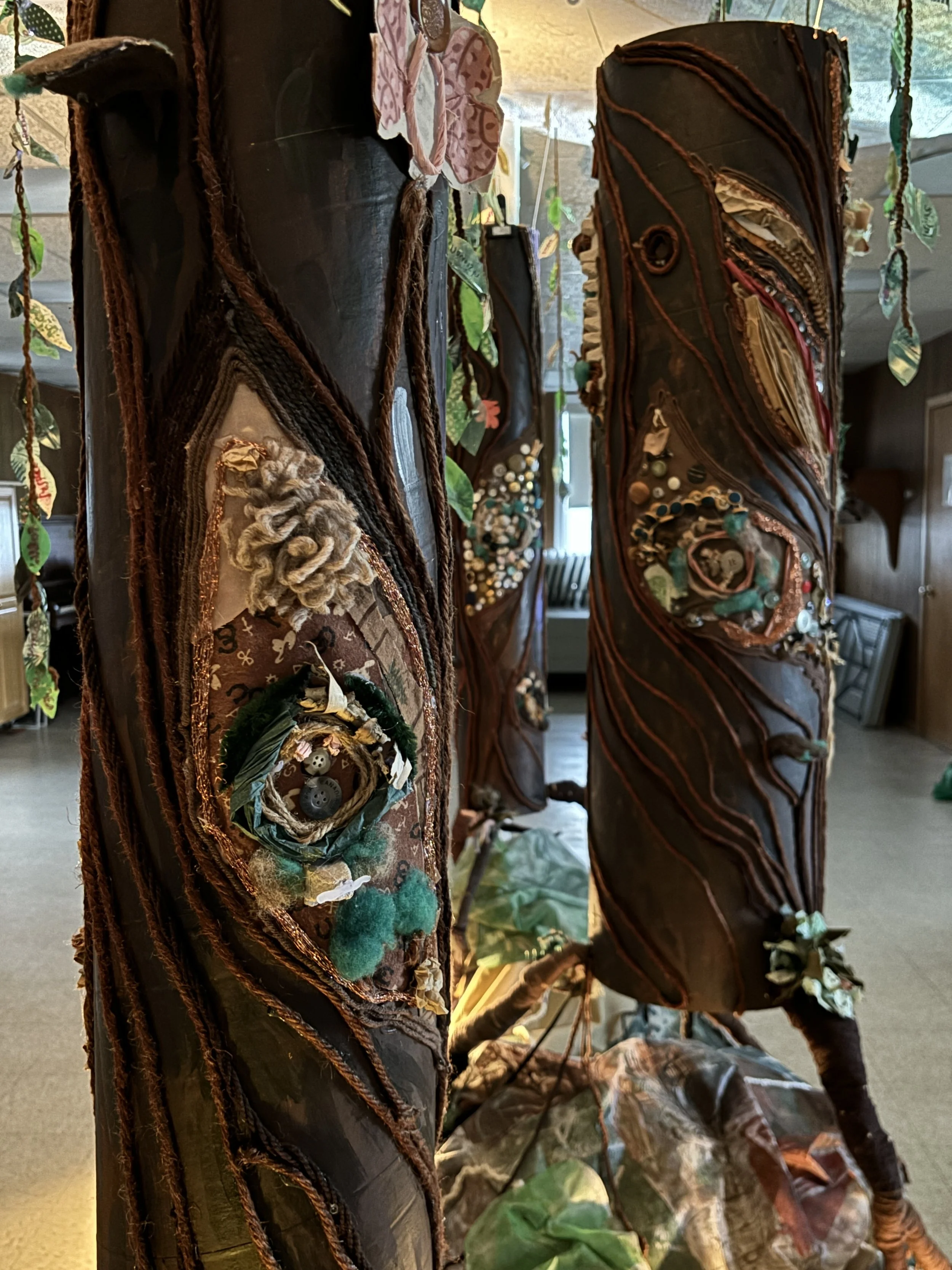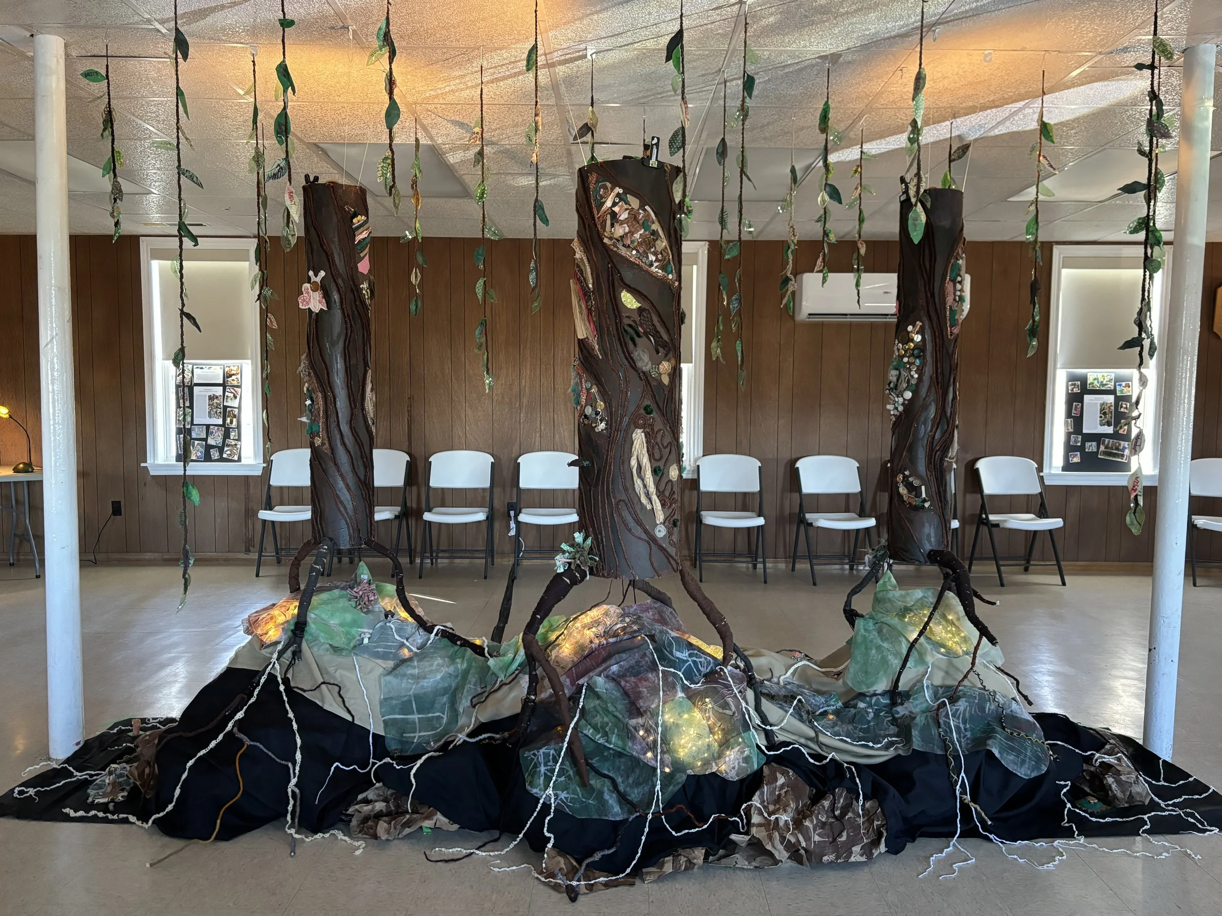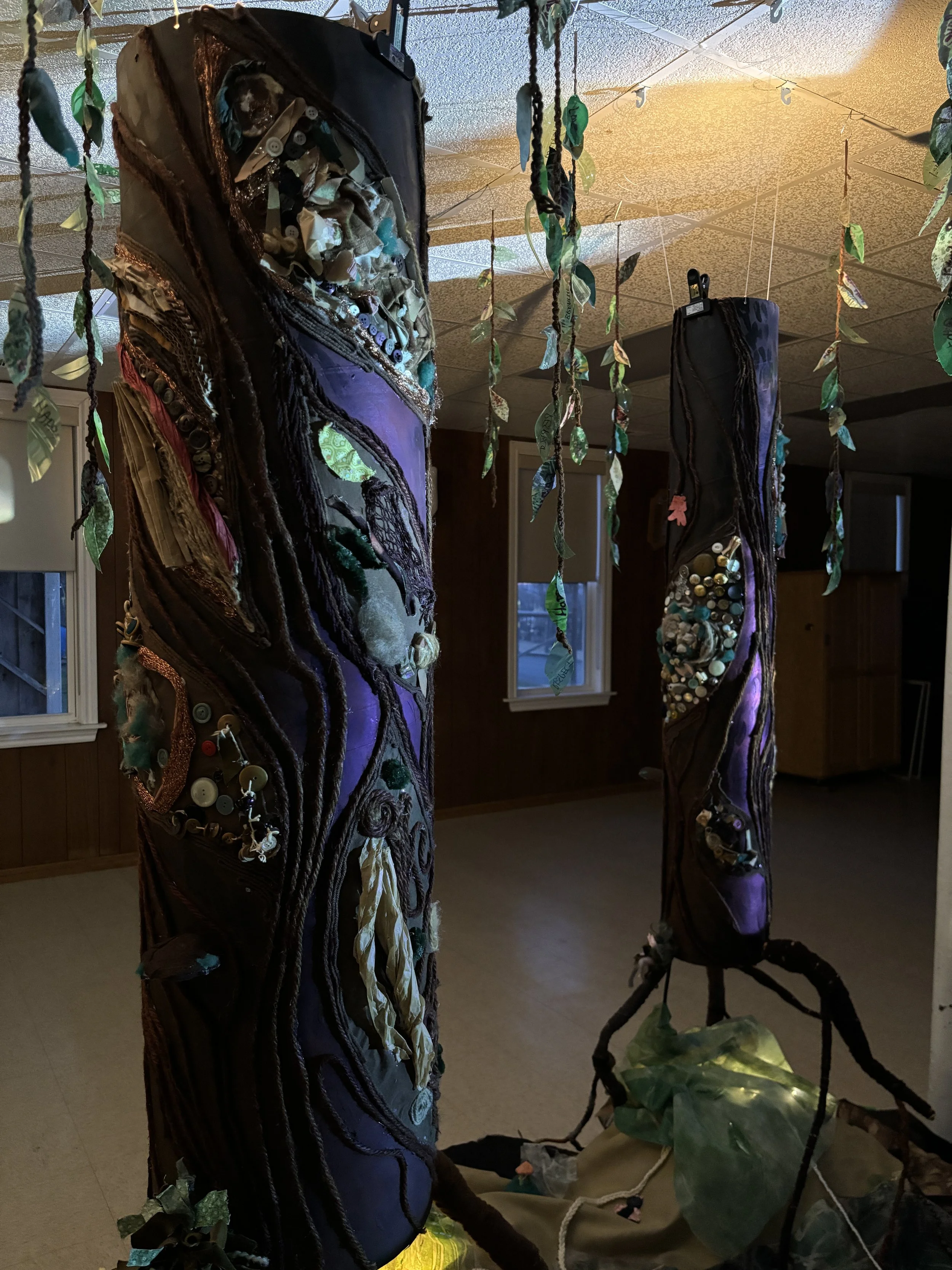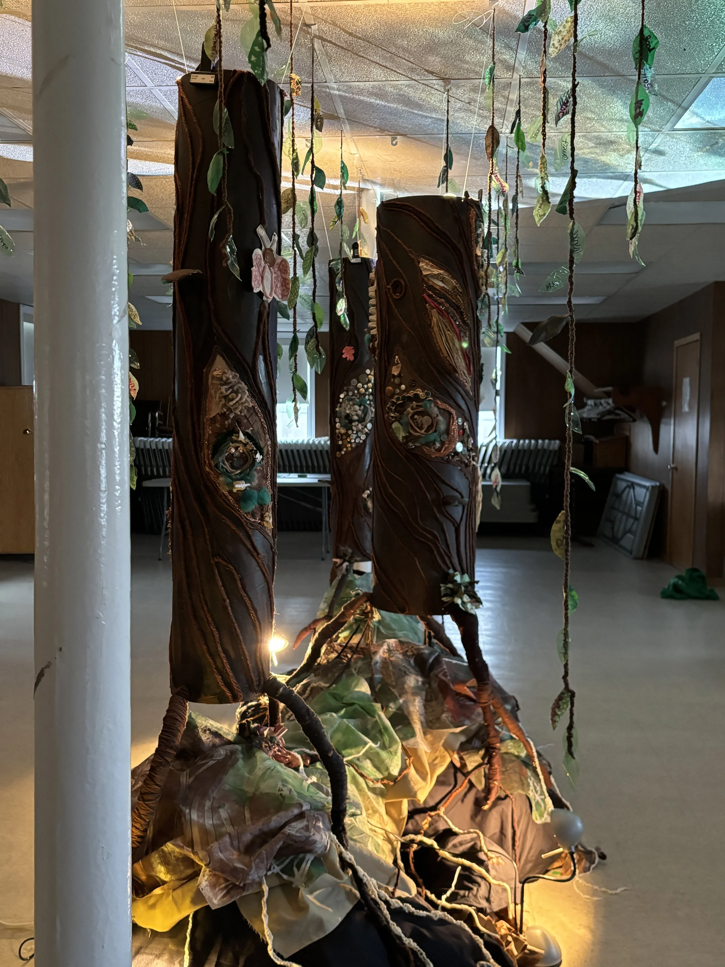 In collaboration with the Conservation Council of New Brunswick, Kim and Anne participated in a 6 month artist residency From Harm to Harmony. [IN]visible is the results of our climate action community project. Over 3 workshops, 10 kids explored environmental topics surrounding forest stewardship. Understanding what goes on in the forest above ground (visible), below ground (invisible) and the overall connection and impact a balanced eco system has on our planet and our lives. A call to action was put out to the community of Keswick Ridge to source recyclable and up cycled materials. Working as environmentally conscious as we could, the kids explored the use of many different materials to collaborate on a 3D forest installation. A collaged mother tree and her young, yarn coiled roots, waxed dipped fabric leaves, crocheted branches and mycelium and an array of mixed media critters and fungi, the installation grew. An exhibition took place on Earth Day, in April 2024. The public was invited for an evening of celebration and great discussion surrounding forest stewardship and climate action art.