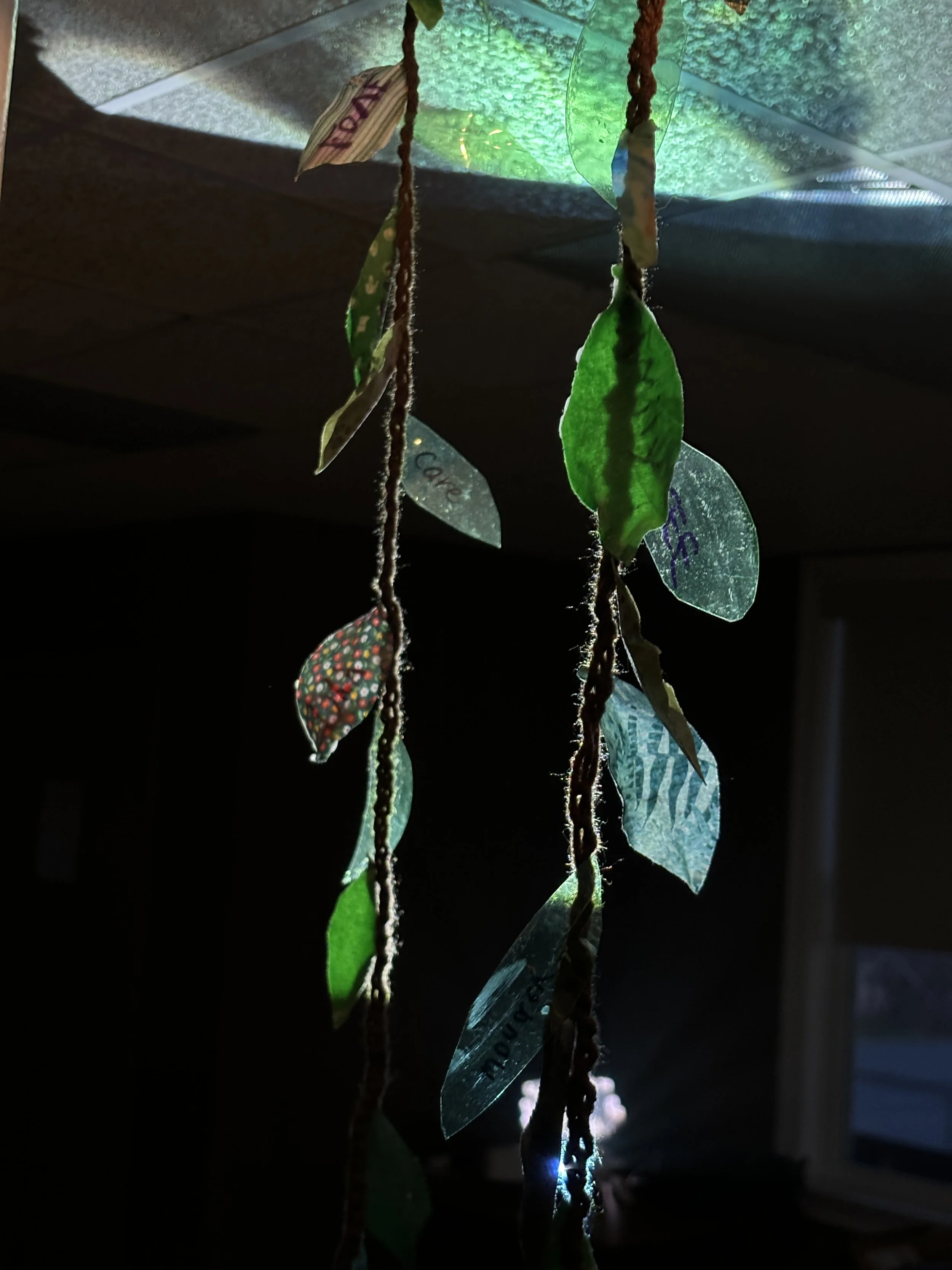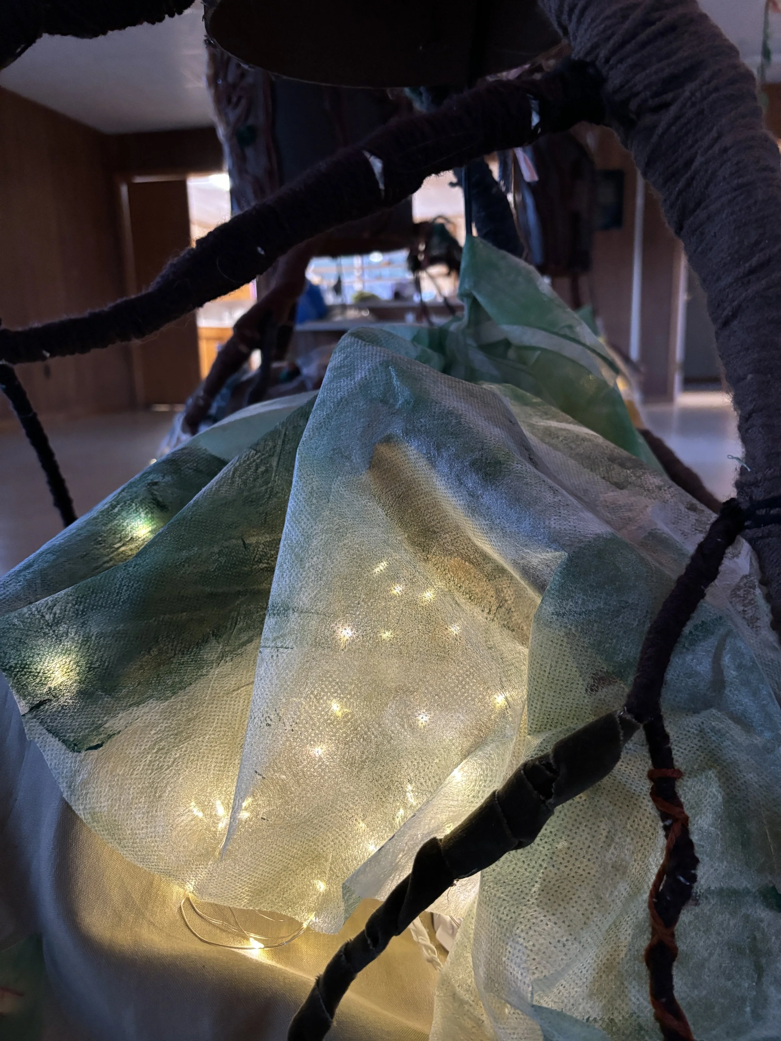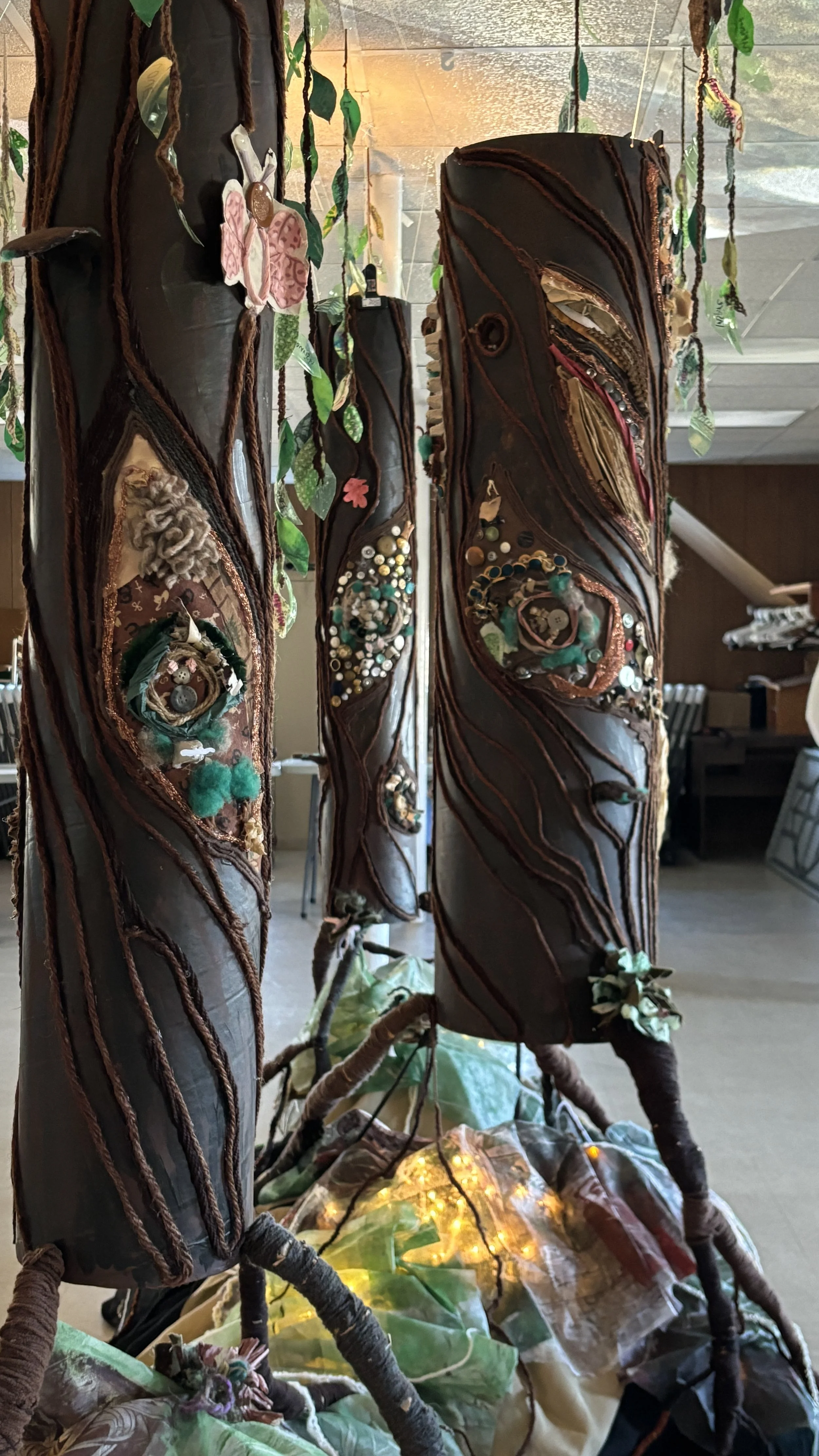 In collaboration with the Conservation Council of New Brunswick, Kim and Anne participated in a 6 month artist residency From Harm to Harmony. [IN]visible is the results of our climate action community project. Over 3 workshops, 10 kids explored environmental topics surrounding forest stewardship. Understanding what goes on in the forest above ground (visible), below ground (invisible) and the overall connection and impact a balanced eco system has on our planet and our lives. A call to action was put out to the community of Keswick Ridge to source recyclable and up cycled materials. Working as environmentally conscious as we could, the kids explored the use of many different materials to collaborate on a 3D forest installation. A collaged mother tree and her young, yarn coiled roots, waxed dipped fabric leaves, crocheted branches and mycelium and an array of mixed media critters and fungi, the installation grew. An exhibition took place on Earth Day, in April 2024. The public was invited for an evening of celebration and great discussion surrounding forest stewardship and climate action art.